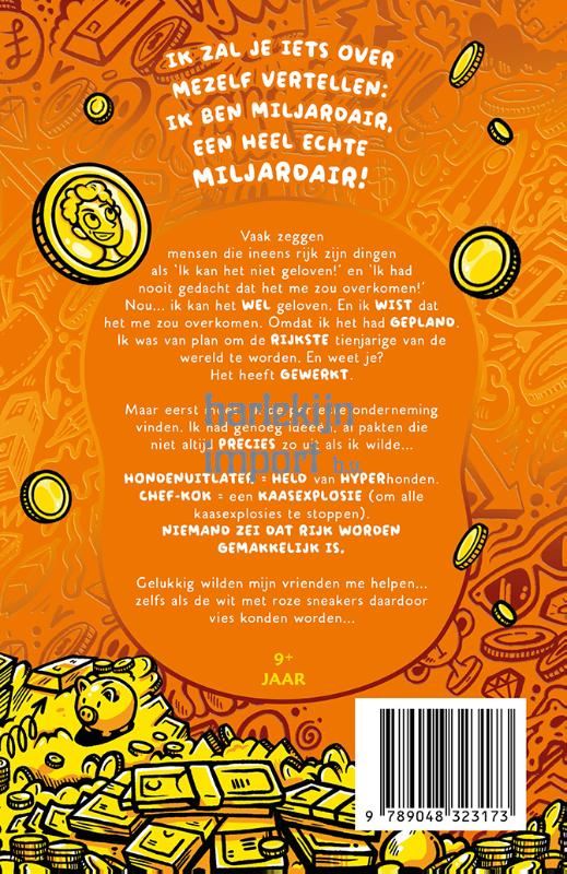 Ik zal je iets over mezelf vertellen: ik ben een miljardair, een heel echte miljardair! Vaak zeggen mensen die ineens rijk zijn dingen als ’Ik kan het niet geloven!‘ en ’Ik had nooit gedacht dat het me zou overkomen!‘ Nou... ik kan het WEL geloven. En ik WIST dat het me zou overkomen. Omdat ik het had GEPLAND. Ik was van plan om de RIJKSTE tienjarige van de wereld te worden. En weet je? Het heeft GEWERKT. Maar eerst moest ik de perfecte onderneming vinden. Ik had genoeg ideeën, al pakten die niet altijd PRECIES zo uit als ik wilde... HONDENUITLATER = HELD van HYPERhonden. CHEF-KOK = een KAASEXPLOSIE (om alle kaasexplosies te stoppen). NIEMAND ZEI DAT RIJK WORDEN GEMAKKELIJK IS. Gelukkig wilden mijn vrienden me helpen... zelfs als de wit met roze sneakers daardoor vies konden worden...