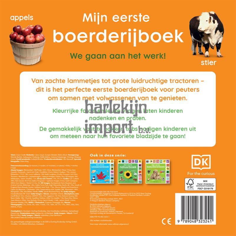 Mijn eerste boerderijboek We gaan aan het werk! Van zachte lammetjes tot grote luidruchtige tractoren – dit is het perfecte eerste boerderijboek voor peuters om samen met volwassenen van te genieten. Kleurrijke foto’s en leuke vragen laten kinderen nadenken en praten. De gemakkelijk vast te pakken tabs nodigen kinderen uit om meteen naar hun favoriete bladzijde te gaan!