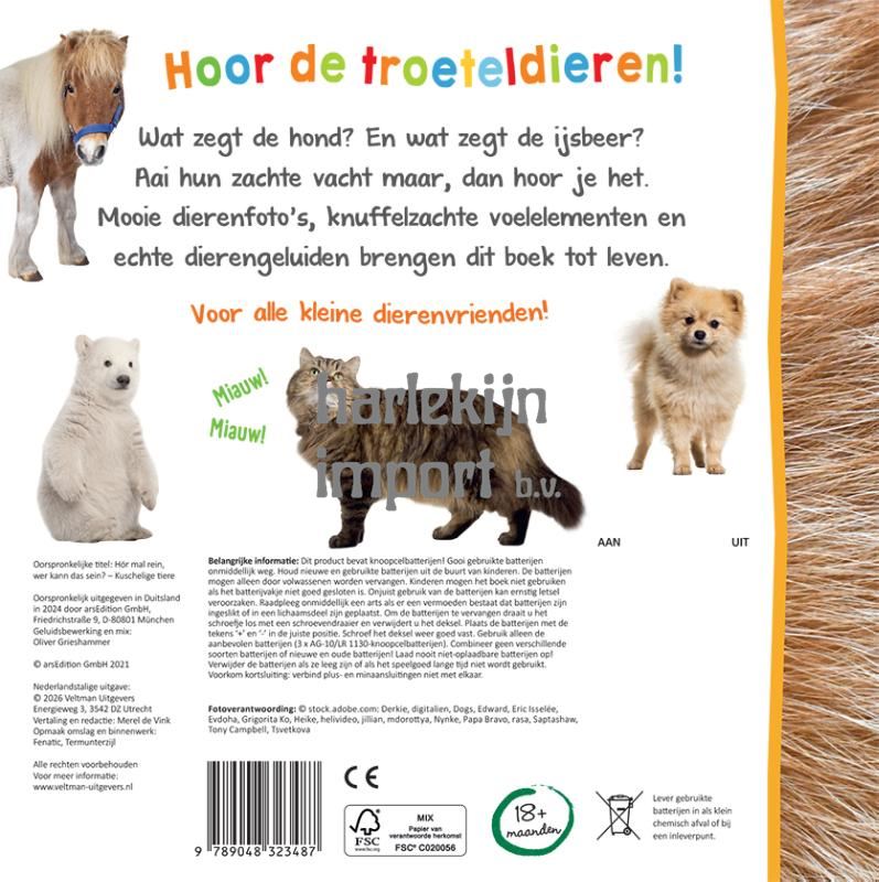 Hoor de troeteldieren! Wat zegt de hond? En wat zegt de ijsbeer? Aai hun zachte vacht maar, dan hoor je het. Mooie dierenfoto’s, knuffelzachte voelelementen en echte dierengeluiden brengen dit boek tot leven. Voor alle kleine dierenvrienden!