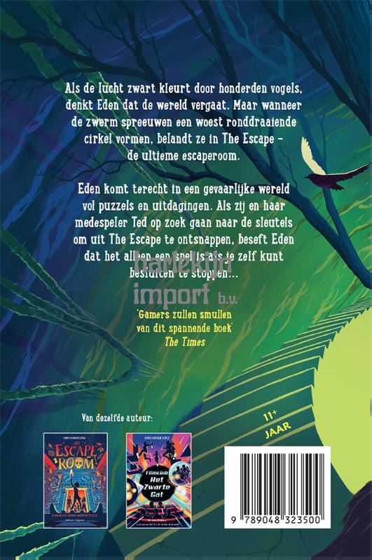 Als de lucht zwart kleurt door honderden vogels, denkt Eden dat de wereld vergaat. Maar wanneer de zwerm spreeuwen een woest ronddraaiende cirkel vormen, belandt ze in The Escape – de ultieme escaperoom. Eden komt terecht in een gevaarlijke wereld vol puzzels en uitdagingen. Als zij en haar medespeler Ted op zoek gaan naar de sleutels om uit The Escape te ontsnappen, beseft Eden dat het alleen een spel is als je zelf kunt besluiten te stoppen...