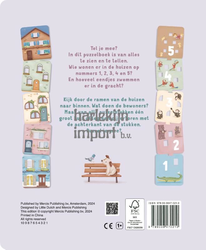 In dit puzzelboek is van alles te zien en te tellen. Wie wonen er in de huizen op nummers 1, 2, 3, 4, en 5? Hoeveel ramen tel je in elk huis? Tel een hoeveel hondjes er aan het spelen zijn. De huizen staan steeds op een andere locatie: aan de haven, een gracht, een pleintje, een park en er is een huis met een grote tuin. Er is niet alleen buiten van alles te zien. Kijk maar door de ramen van de huizen naar binnen. Wat doen de bewoners? De puzzelstukken zijn aan beide zijden bedrukt. Als je de puzzelstukken uit het boek haalt, kun je met alle stukken één groot huis maken. Of leg een cijfertoren met de achterkant van de stukken. Puzzel je mee?