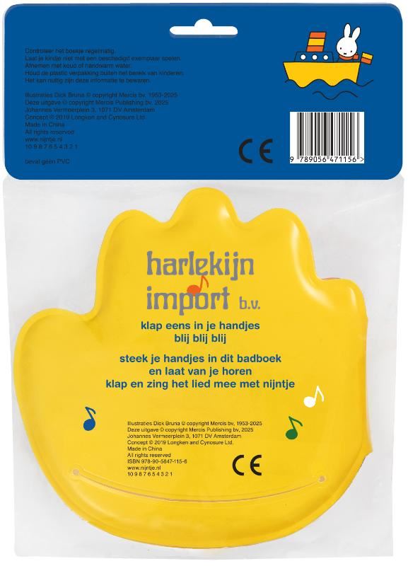 Klap eens in je handjes, blij blij blij! Steek je handjes in het badboek en laat van je horen. Het badboek heeft de vorm van een handje en sluit met een magneet waar een rammelaar in zit. Zo kun je tijdens het badderen met het welbekende liedje meeklappen. Het feestelijke badboek verschijnt in een eenmalige oplage ter ere van 70 jaar nijntje.