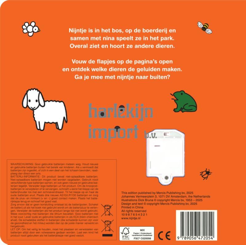 Nijntje is in het bos, op de boerderij en samen met nina speelt ze in het park. Overal ziet en hoort ze andere dieren. Een interactief geluidenboek voor de allerkleinsten. Open de flapjes op de pagina's en ontdek welke dieren de geluiden maken.