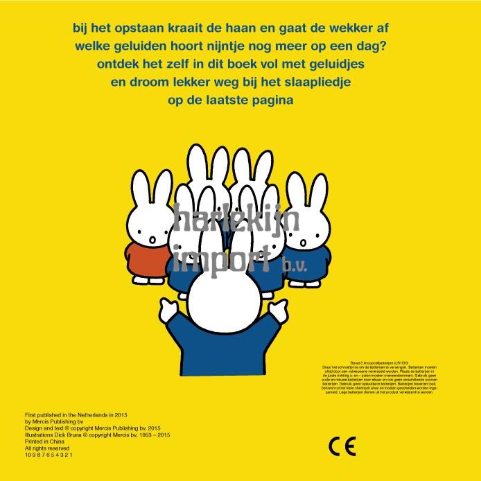 Luister mee wat nijntje hoort op een dag in dit vrolijke geluidenboek. Bij het opstaan kraait de haan en gaat de wekker af. Welk geluid maakt de koe en herken je de fietsbel? Zing mee met het nijntje lied en droom weg bij het slaapliedje op de laatste pagina. De liedjes zijn lekker lang voor optimaal luisterplezier. Er is genoeg te horen in dit boek vol met geluidjes. Als je nogmaals op het muzieknootje drukt stopt het geluid vanzelf. De meegeleverde batterij is verwisselbaar.