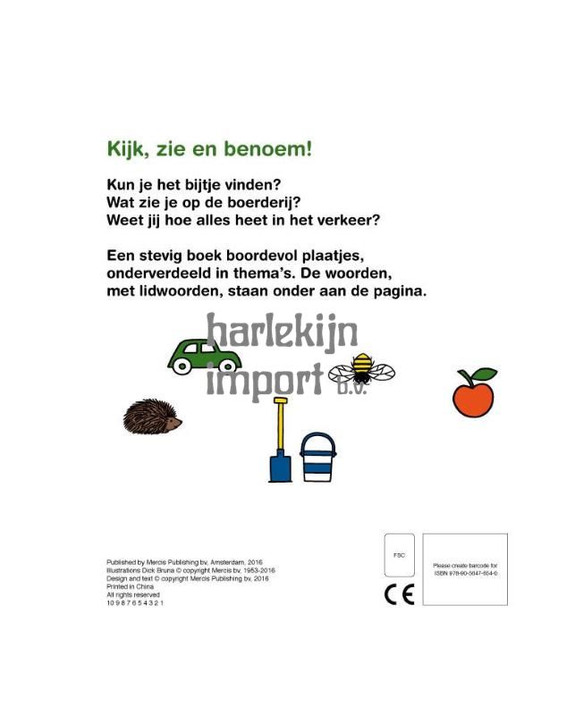 Het nijntje aanwijsboek is een lekker groot en stevig boek boordevol plaatjes. Per spread staat een thema centraal, zoals ‘op de boerderij’ en ‘in het verkeer’. Onder aan de pagina staan de woorden genoemd, inclusief lidwoorden, om voorlezers met Nederlands als tweede taal te helpen bij het benoemen van de plaatjes.