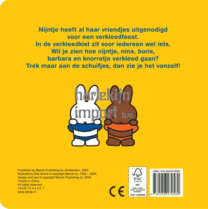 Nijntje heeft haar vriendjes uitgenodigd voor een verkleedfeest. Er is een verkleedkist met voor iedereen iets. Wil je zien hoe nijntje, nina, boris, barbara en knorretje verkleed gaan? Trek maar aan de schuifjes, dan zie je het vanzelf! Een vrolijk geïllustreerd en stevig kartonboek met schuifjes. Met een aansprekend thema; verkleden is niet alleen leuk in de carnavalsperiode!