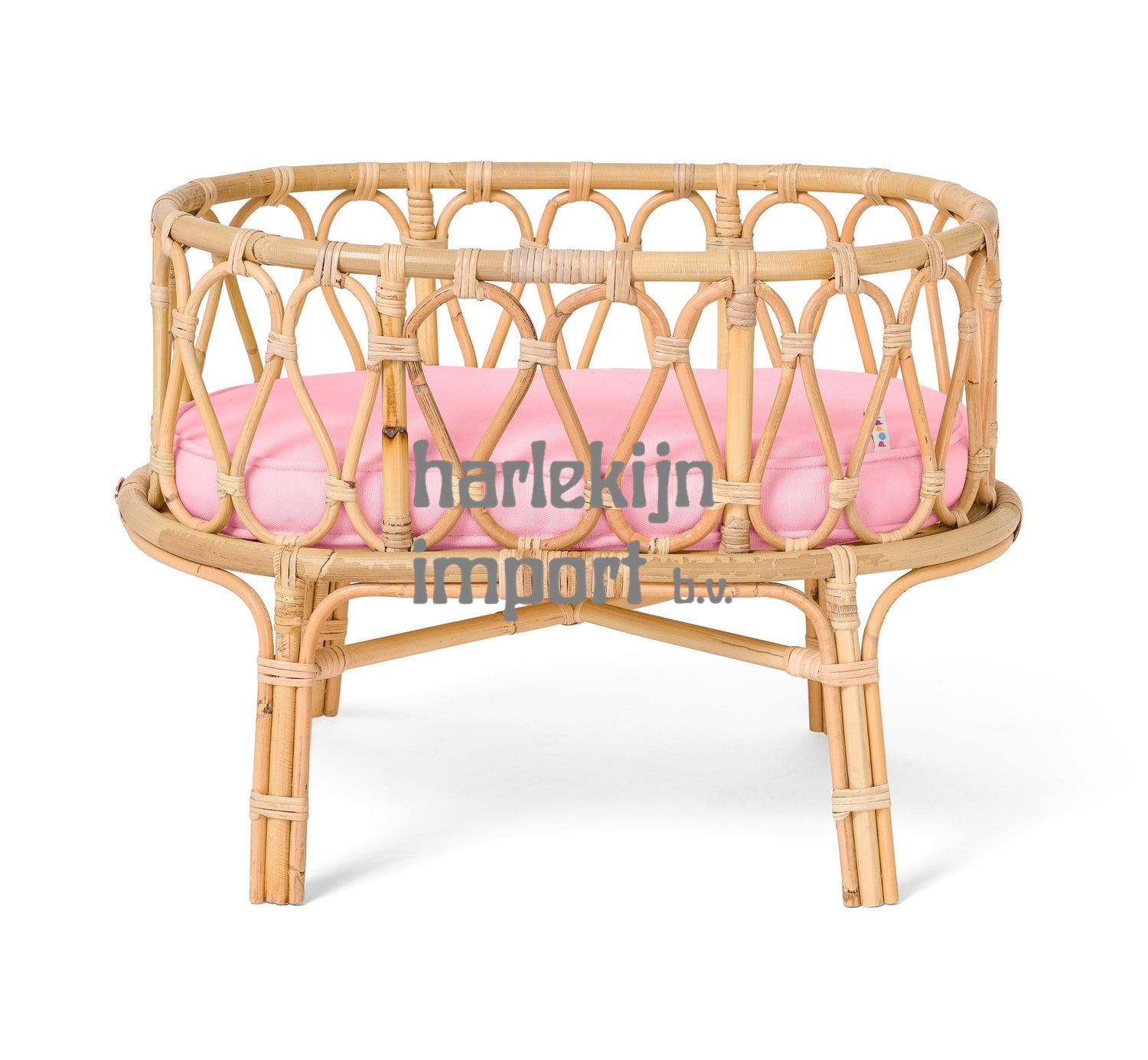 PT 1808 Poppie rotan poppenwiegje met roze matrasje.