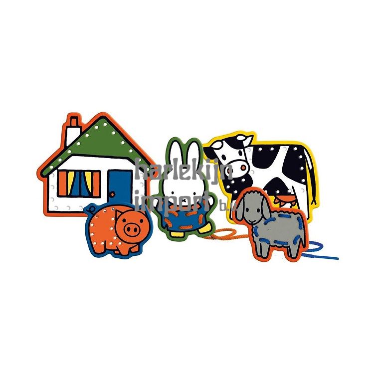 Set van 5 boerderij rijgkaarten zoals Nijntje, een koe, schaapje, varken en boerderij inclusief rijgveters in verschillende kleuren.