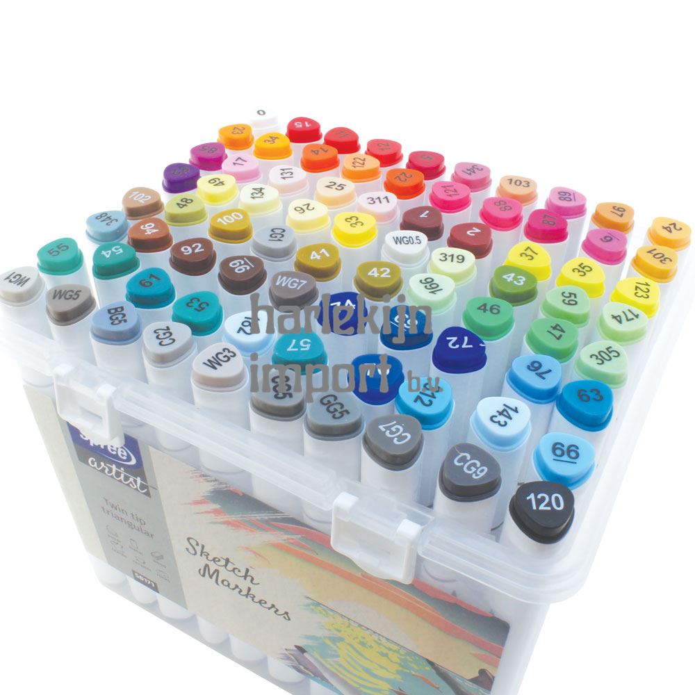 80 Dubbelpuntige stiften. 80 kleuren. 3/6 mm, driehoekige kunstschets. Op alcohol gebaseerd. PP-doos. |