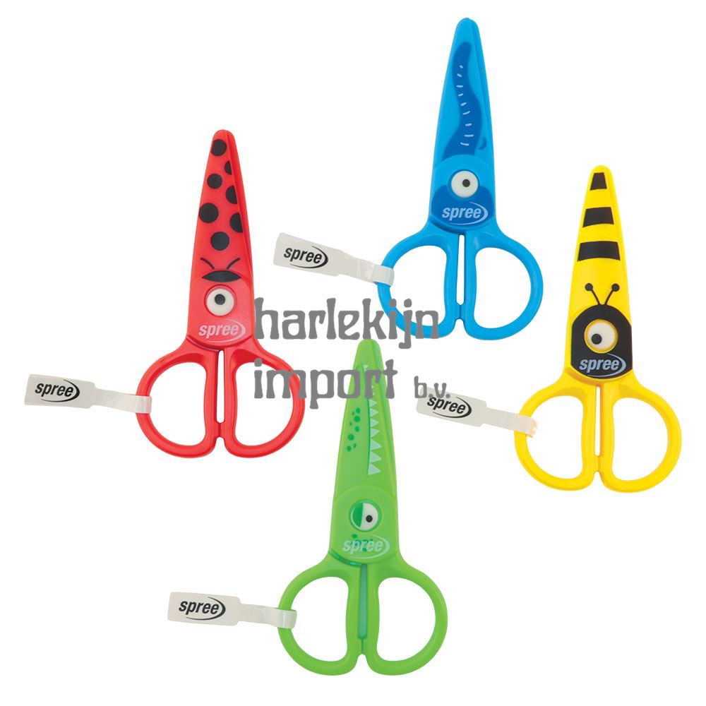 Display Kinderschaar met plastic lichaam en messen, 12,2 cm. 4 kleuren met dierenmotief. 24 stuks in display.