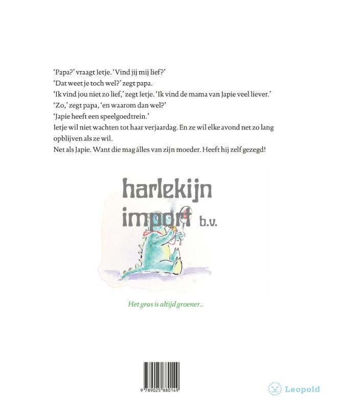 ‘Papa?’ vraagt Ietje. ‘Vind jij mij lief?’<br> ‘Dat weet je toch wel?’ zegt papa.<br> ‘Ik vind jou niet zo lief,’ zegt Ietje. ‘Ik vind de mama van Japie veel liever.’<br> ‘Zo,’ zegt papa, ‘en waarom dan wel?’<br> ‘Japie heeft een speelgoedtrein.’<br> Ietje wil niet wachten tot haar verjaardag. En ze wil elke avond net zo lang opblijven als ze wil.<br> Net als Japie. Want die mag álles van zijn moeder. Heeft hij zelf gezegd!<br> <br> Het gras is altijd groener...