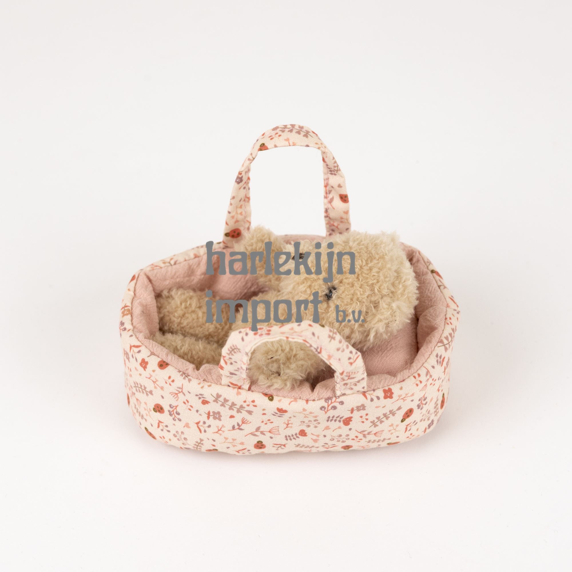 Knuffel: Mini Morris in een draagmand. 10x15x6 cm. 0+
