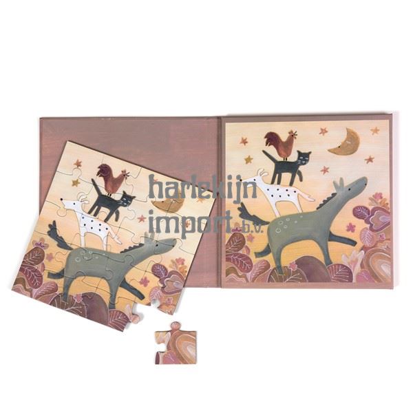 Open de flappen van dit magnetische spel en ontdek twee 20-delige puzzels met de Bremer muzikanten.