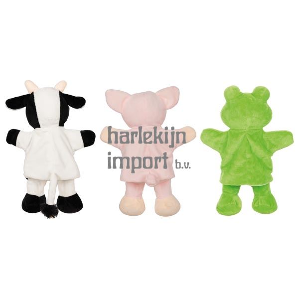 Handpoppen koe, varken, kikker (met poten). 30 cm. 1+