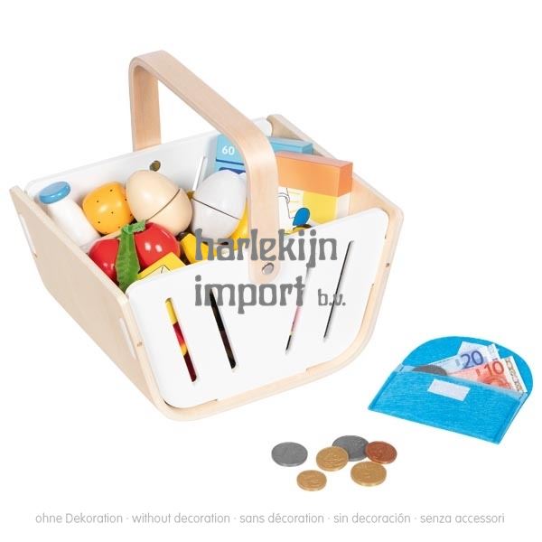 Meer dan alleen een accessoire voor een speelgoedwinkel! Deze modern ogende houten winkelmand is ongewoon licht. Het uitdagende ontwerp is op hoge hoogte uitgevoerd qua uiterlijk en kwaliteit. De basis en voorzijde zijn gemaakt van één stuk gebogen multiplex. Het handvat is ook gemaakt van één stuk gebogen multiplex. De indeling van de spleten in de witte zijpanelen versterkt de stijlvolle algehele uitstraling. De vilten tas is een kleine, kleurrijke toevoeging, maar ook een handig accessoire. Algemene beoordeling: Een aanbevolen speelgoed voor winkelgerelateerde rollenspellen die ook gebruikt kunnen worden voor 'echt' winkelen.