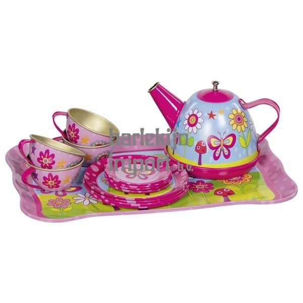 Tinnen Theeservies Funky Flowers. 23,5x15,5 cm. 2+