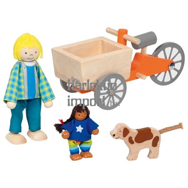Bakfiets met 2 buigzame poppen en hond. 16x6,8x7,5 cm. 4 delig. 3+ |