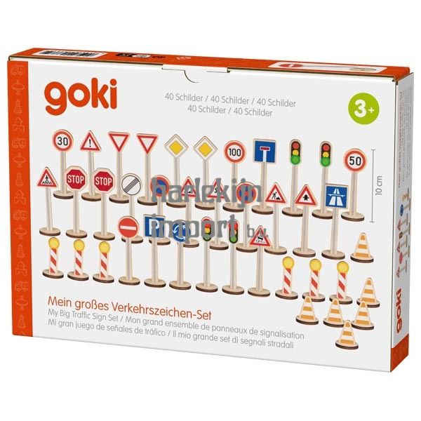 Auto's, wegen, verkeersborden – alleen wanneer alle drie de elementen samenkomen, kan er een echt verkeersspel worden gemaakt in de kinderkamer. >br< De goki-verkeersbordenset bestaat uit 40 (!) verkeersborden – genoeg om het wegennet van een hele stad uit te rusten. De borden en voeten zijn gemaakt van multiplex. De verkeersborden zijn een uitstekende aanvulling op de goki FlexiRoads wegwerkset, Artikel 53765. Het belang van het leren van de betekenis van individuele verkeersborden door middel van spel spreekt voor zich, en wij achten het noodzakelijk in het belang van vroege, effectieve en kindvriendelijke verkeersveiligheidseducatie. >br< Conclusie: Een waardevol speelgoed met een hoge speelwaarde.