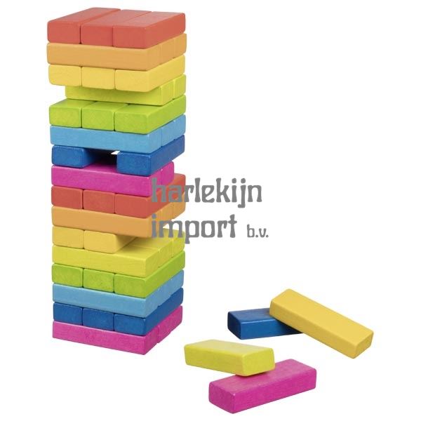Tuimelende toren Regenboog. 48 delig. 7,5x7,5x24 cm. 4+