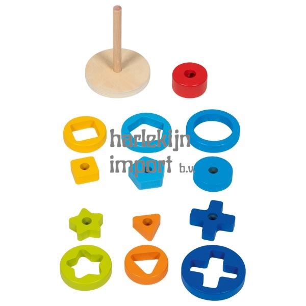 Stapelen volledig opnieuw uitgevonden. Een stapel- en leerspel met puzzelelementen. Elke stapelring bevat een specifiek gevormd stuk. De eerste stap is het plaatsen van het gevormde stuk van de grootste ring (blauw) over de stapelstaaf. Dan komt de ring, die zo goed geplaatst moet worden dat hij perfect over het (blauw) gevormde stuk past. De toren wordt ring voor ring op dezelfde manier opgebouwd. Deze stapeltoren is een houten speelgoed dat het leerproces boeiend houdt dankzij de geweldige speelstijl. Zeer aanbevolen.
