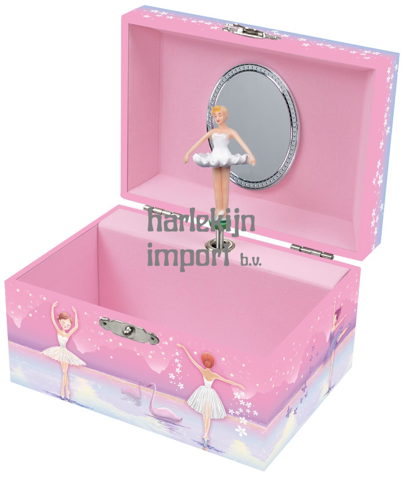 Juwelendoos - muziekdoos: Ballerina met zwanen. Figuur in doosje: Ballerina wit. Melodie: Twinkle Twinkle. 3+ |