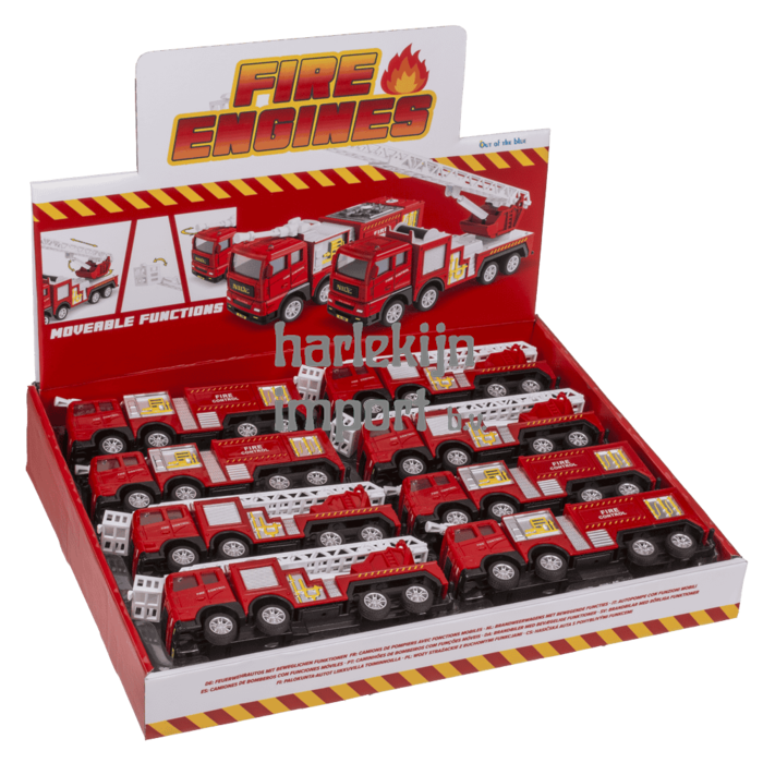 Omschrijving Dsp Brandweervoertuigen met beweegbare functies. 2 assortie. 16,5 cm. 8 stuks in display.