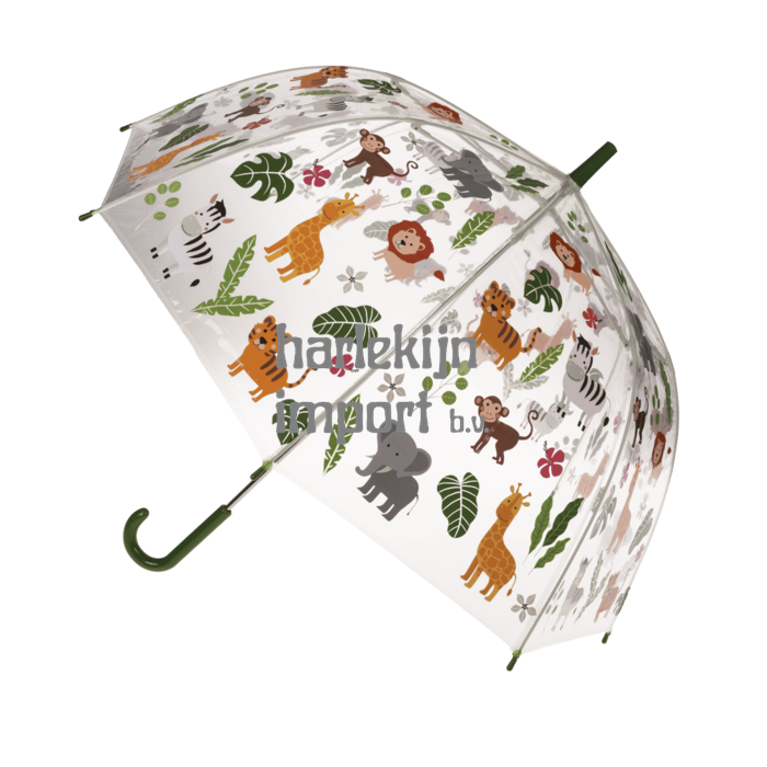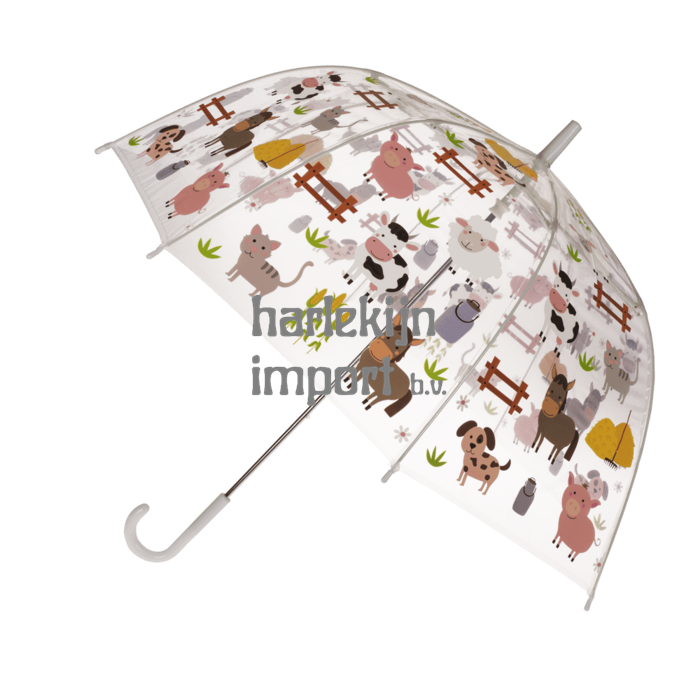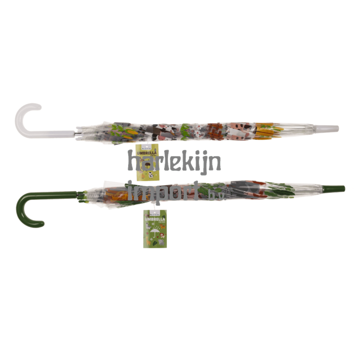 Transparante kinderparaplu. D: ca. 72 cm. 2 assortie, bosdieren/boerderijdieren. met 8 stutten en handmatige opening, afdekking 100% polyester.