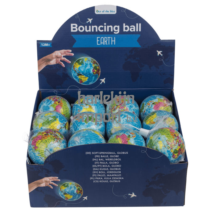 Dsp. Zachte springbal, wereldbol, 7,5 cm. 24 stuks in display. 4+ |