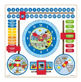 Houten Bumba kalenderklok met schuifjes welke dagen van de week, maanden, weer, tijd en activiteiten aangeven. 3+