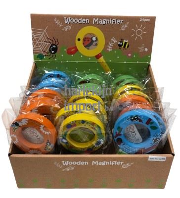 Houten vergrootglas. 4 assortie. 12 stuks in display. 3+
