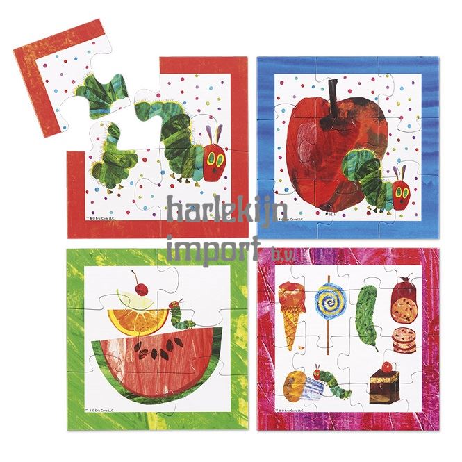 Deze set bestaat uit 4 puzzels met bontgekleurde afbeeldingen uit het boek Rupsje Nooitgenoeg.
