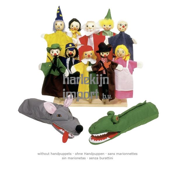 De stevige houten standaard is perfect voor het tentoonstellen van de handpoppen.