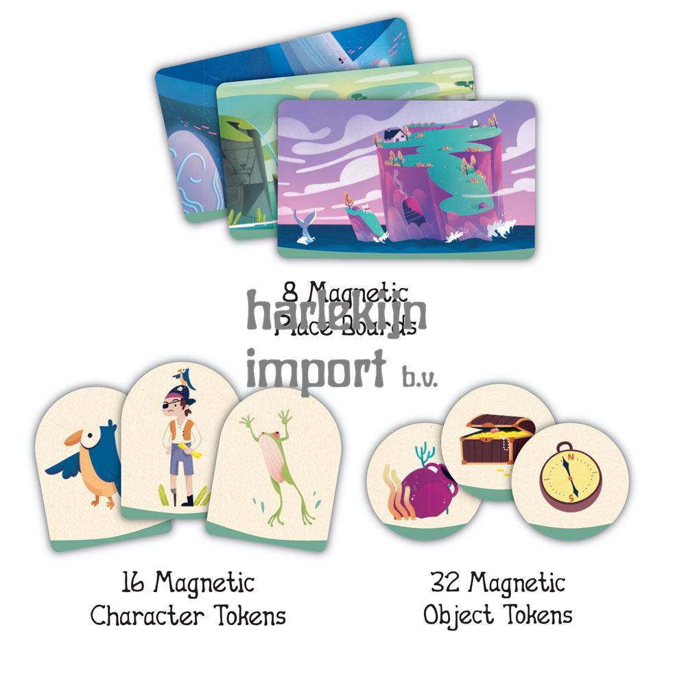 Zeer origineel, gemaakt van veilige materialen met een eigentijdse twist, dit spel bevat magnetische tokens met 8 plaatsen, 16 tekens en 32 objecten, veilig opgeborgen in katoenen zakjes.